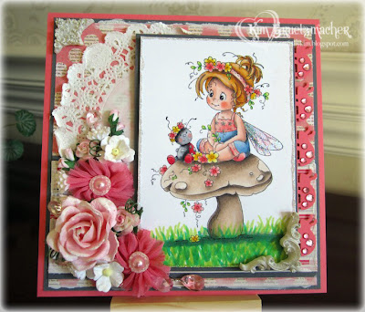 I am totally in love with all of these new stamps! I just can't wait to get home from work each day so I can color!! The whimsical fun each of these images has is so adorable! When I was creating this card I was feeling in a shabby chic kind of mood! I've used crackle paint on the edges of the papers as well as the doilie and flowers for some added chic-ness! Paper are from the gorgeous